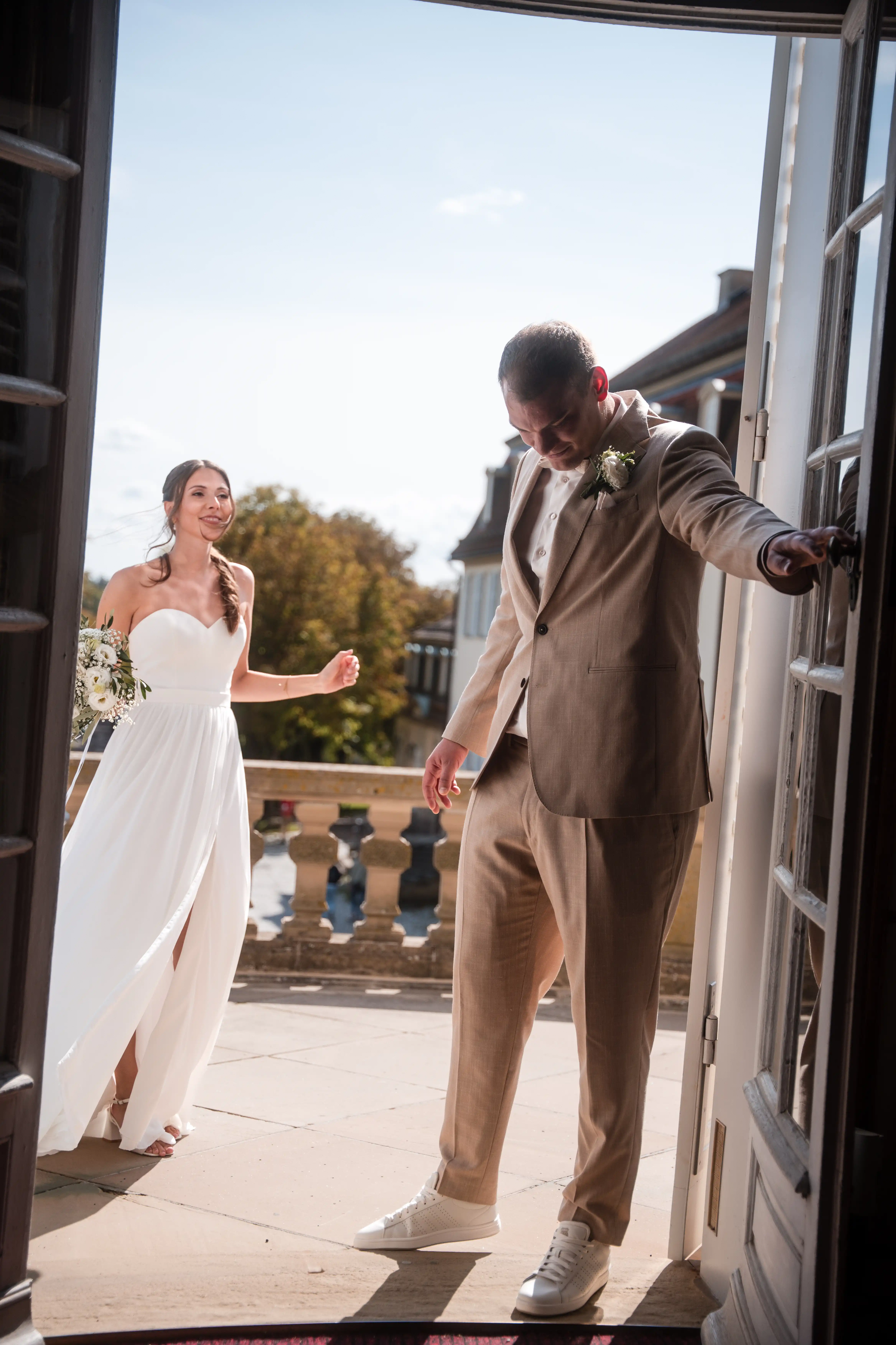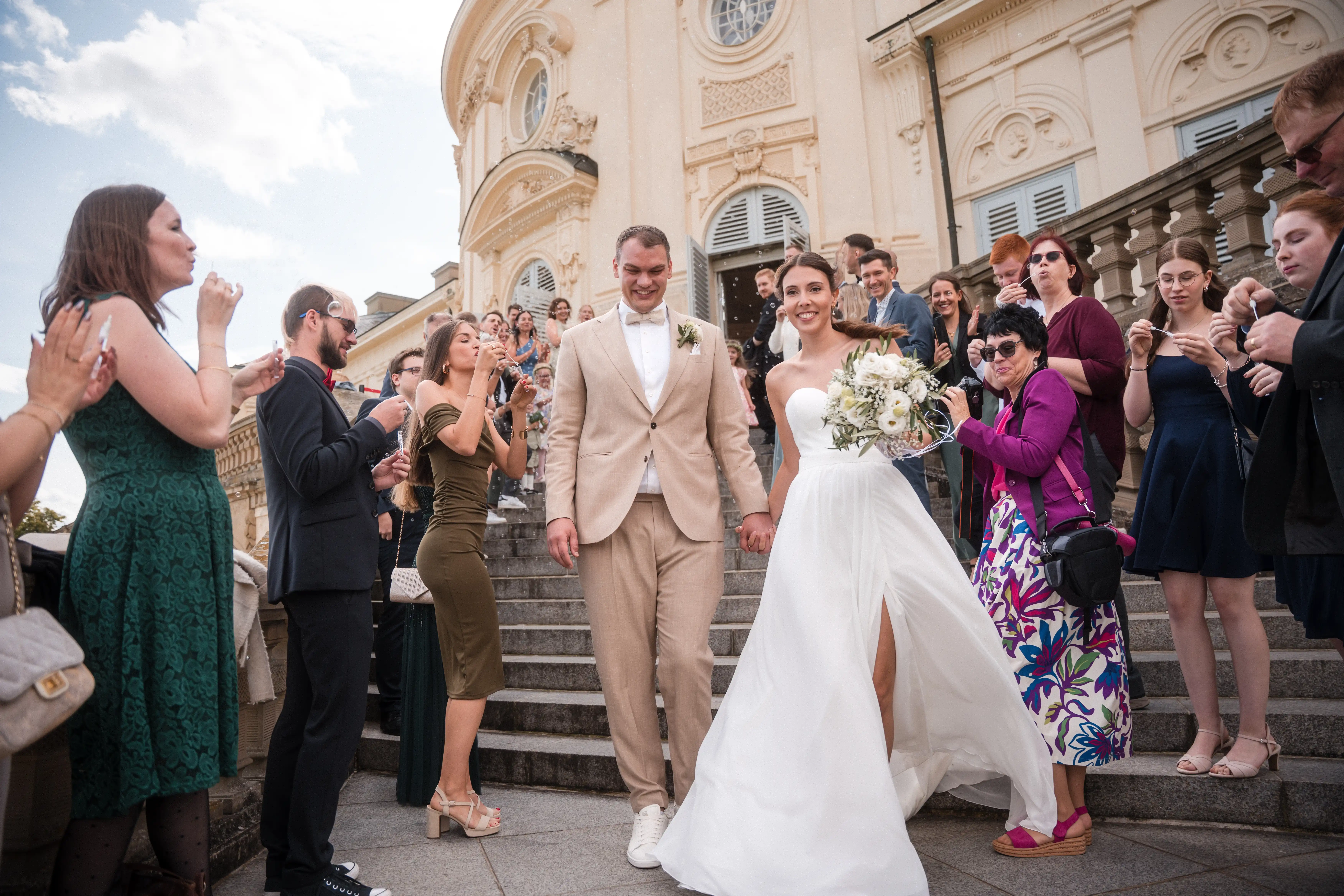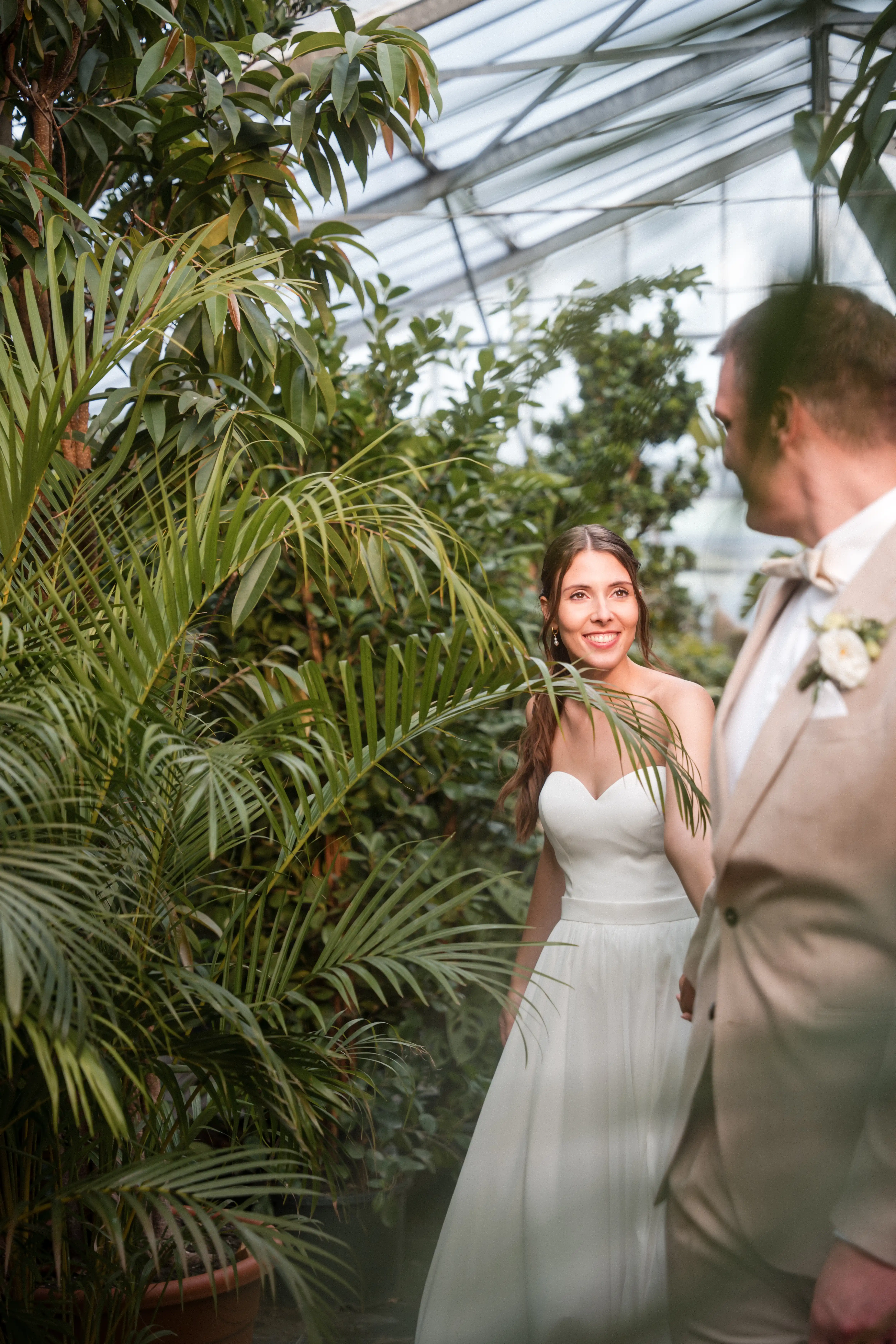 Royale Trauung trifft auf Wintergarten. Bei dieser Hochzeit passte einfach alles: eindrucksvolle Schlossatmosphäre, genau das richtige Maß an Sonne für die perfekte Lichtstimmung und ein ausgelassenes Fest im Grünen.